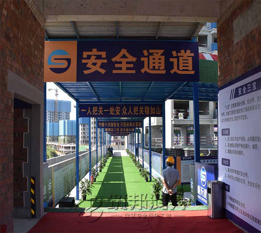 安全通道,施工現(xiàn)場(chǎng)實(shí)行人車分流,主要人員出入通道搭設(shè)了專用安全通道,安全通道兩側(cè)設(shè)置宣傳欄,提升施工作業(yè)人員的質(zhì)量意識(shí)、安全意識(shí)。