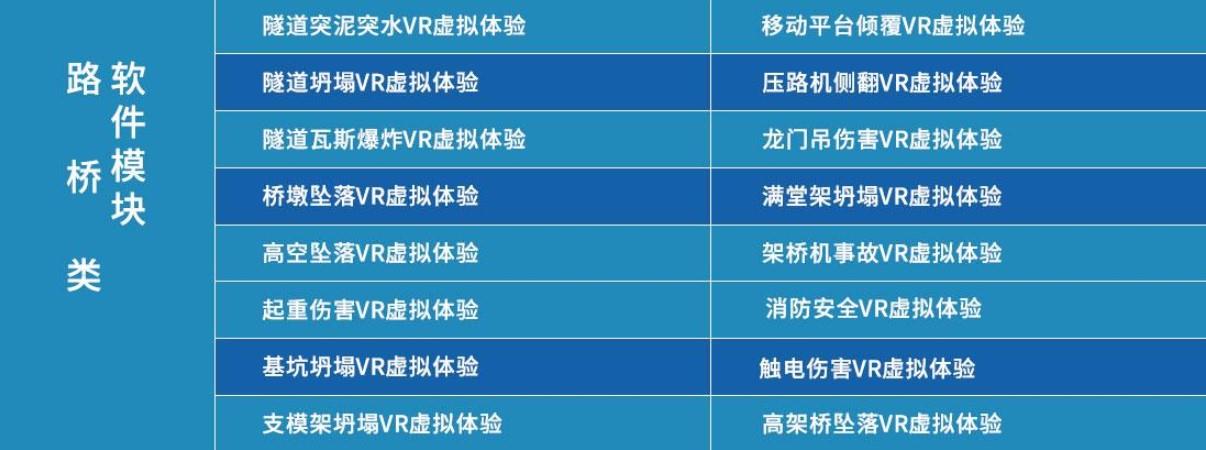 VR安全體驗館的體驗項目包括了房建、地鐵、路橋等多個模塊的內容,具體如下: