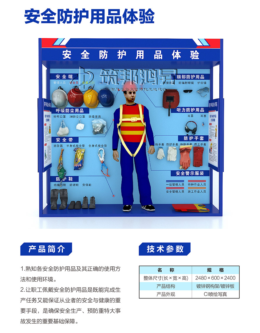 【筑邦鴻昇】安全體驗館內一般配置安全帶使用體驗、洞口墜落體驗、消防器材演示體驗、安全帽撞擊體驗、綜合用電體驗、現場急救體驗、平衡木體驗、鋼絲繩使用體驗、安全防護用品展示培訓、垂直爬梯演示體驗、鋼絲繩演示體驗、吊運體驗、欄桿推倒體驗、平衡橋/斜屋面行走體驗、機械傷害體驗、移動式平臺傾倒、電焊機操作體驗、重物 等搬運體驗、墻體傾倒體驗、人字梯體驗等幾十種體驗設施。這些基本涵蓋了建筑施工現場容易發生安全事故的危險源。