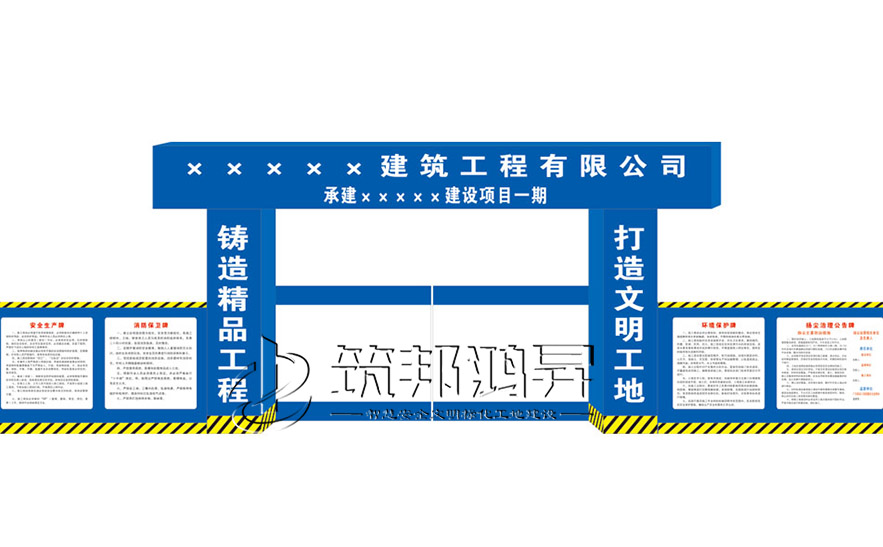 施工現(xiàn)場(chǎng)出入口必須設(shè)置工地大門,大門上端設(shè)門頭,門頭設(shè)置企業(yè)標(biāo)志,整體形象符合施工企業(yè)CI要求,整潔大方。